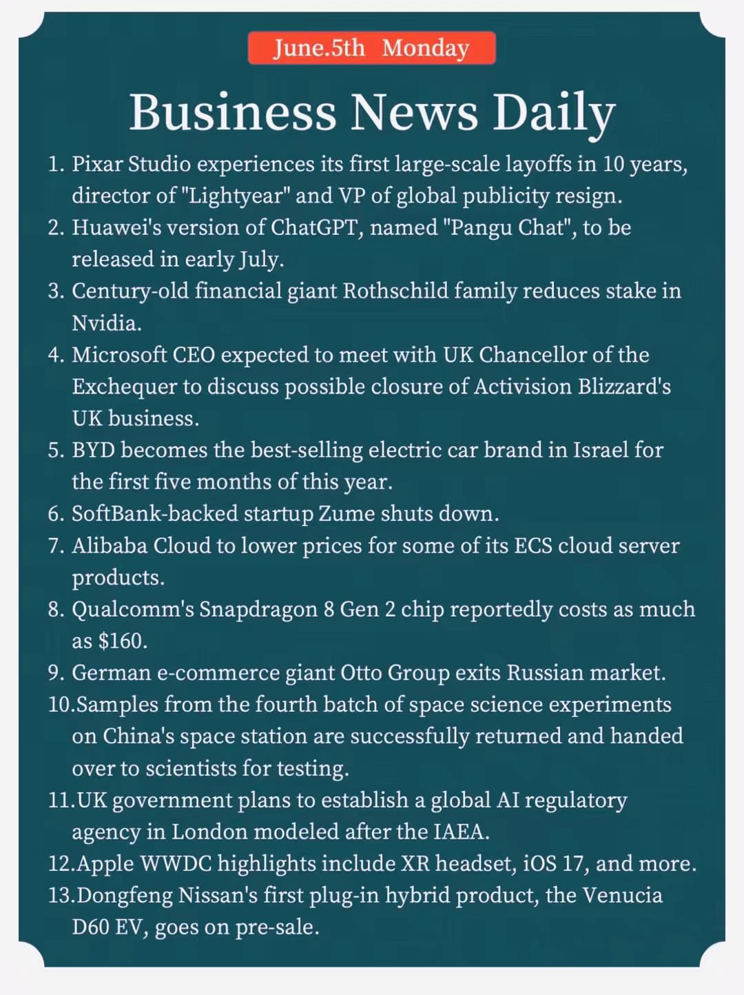 12.Apple WWDC highlights include XR headset, iOS 17, and more. 13.Dongfeng Nissan's first plug-in hybrid product, the Venucia D60 EV, goes on pre-sale.