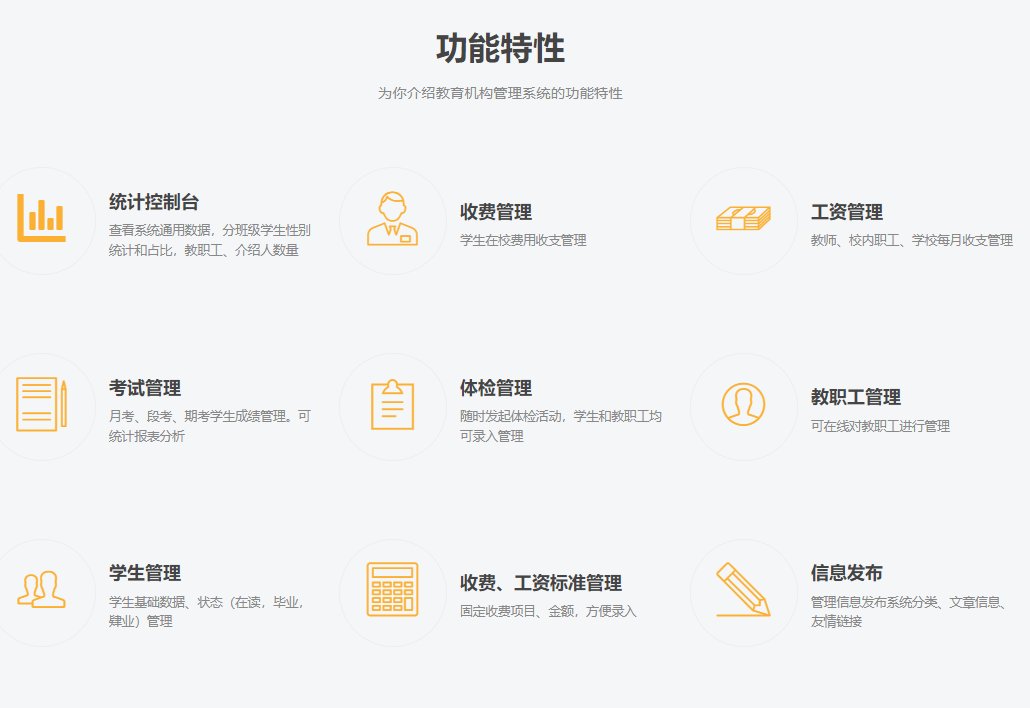 ng体育公司为教育机构量身打造的全场景运营管理系统,涵盖了统计控制台、考试管理、统计报表分析、学生管理、收费管理、体检管理、收费、工资标准管理、教职工管理和信息发布等多个模块,全方位解决教育机构经营管理难题。ng体育公司提供定制化的管理系统开发服务,有相关需求的企业或者创业者请与我司联系。