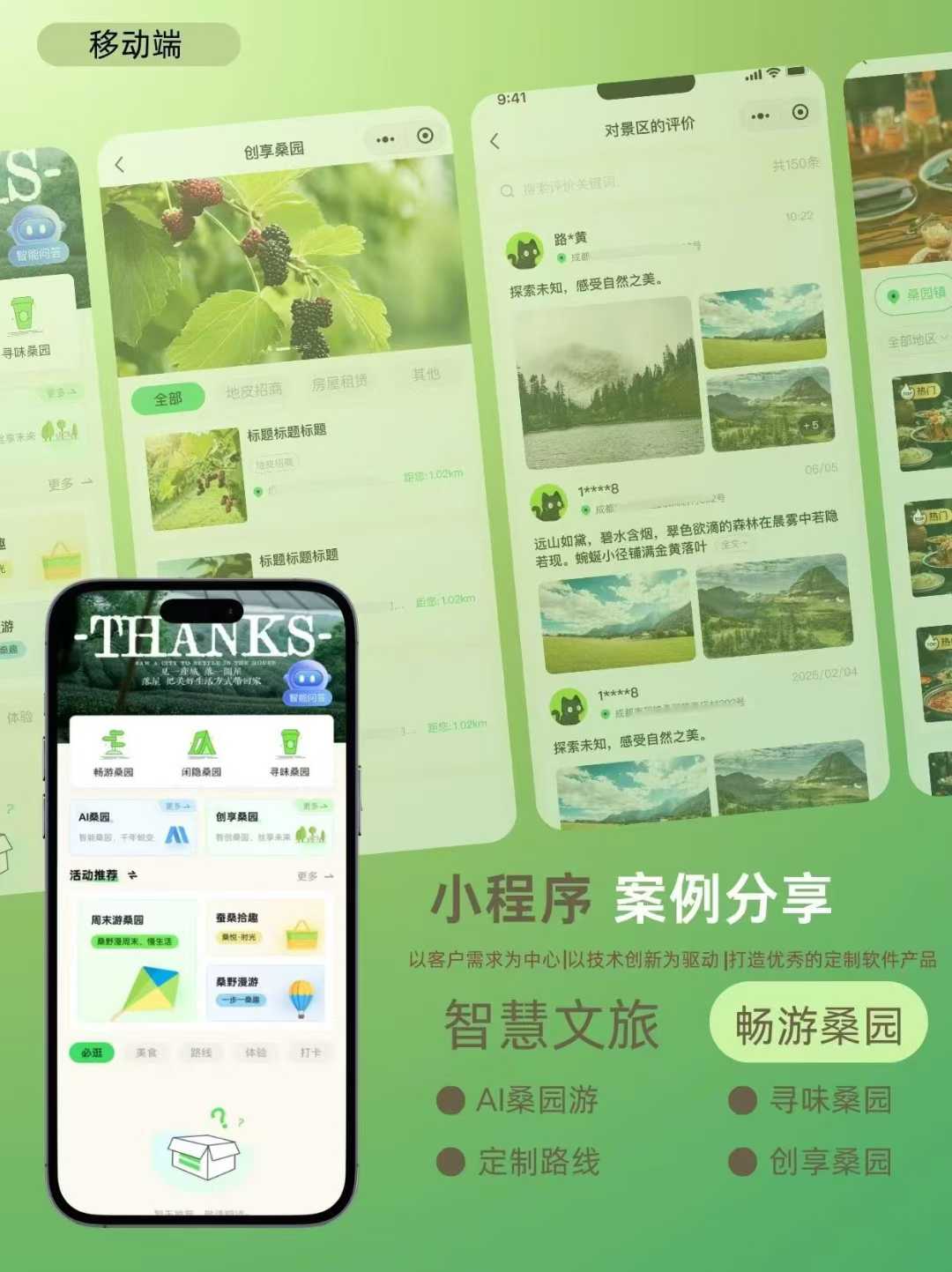 上周跟着朋友去了趟桑园旅游小镇,从市区自驾过去也就一个多小时,原以为这种主打蚕桑文化的小众村镇会像以前去过的很多地方一样——找景点得靠路边问路、订民宿要在好几个平台间切换比价、想尝当地特色菜还得担心踩雷,没想到刚进镇口的游客中心,工作人员就递来一张印着“桑园智旅”小程序的浅青色卡片,笑着说“这趟在桑园的所有需求,扫它基本都能解决”。抱着半信半疑的心态扫码登录,没成想这趟旅程的顺畅度,竟远远超出了预期。