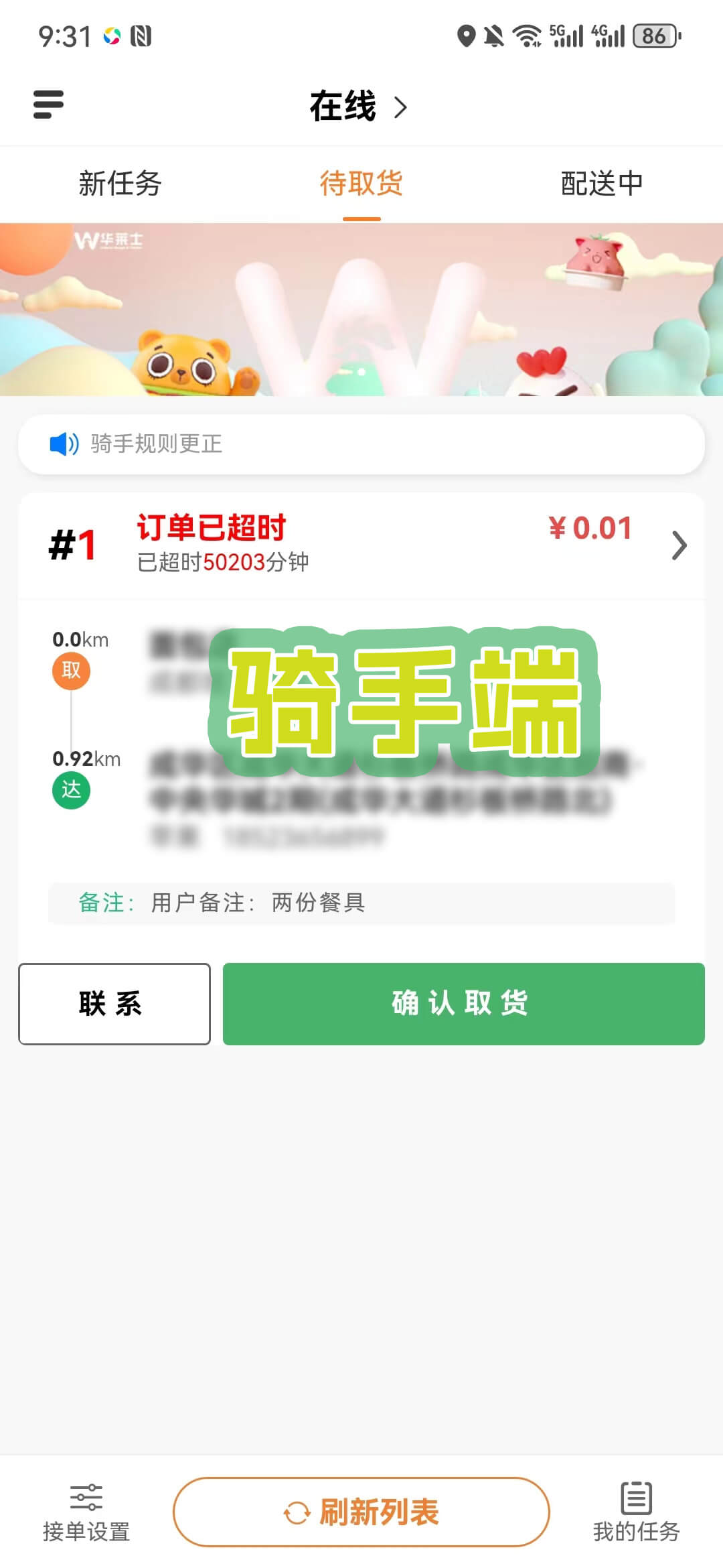 主页面布局清晰,分为新任务、待取件、代送达三个进度界面。订单分类明确,根据用户下达的不同类型的订单,都会有明显的标签区分,如外卖订单、普通订单、跑腿订单(帮买、帮送)、调度台指派单、调度台改派单、预约订单等。