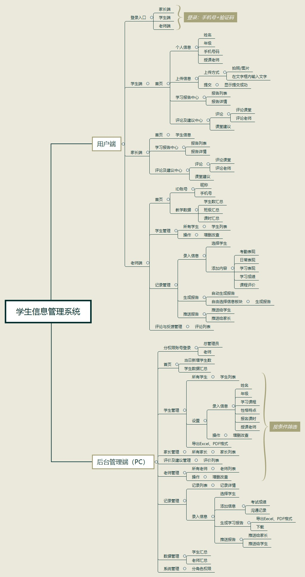 学生端:包含了个人信息,年级、姓名、手机号码、授课老师。学生需要上传个人信息,系统进行实名认证。系统接入人脸识别,学号+身份证信息,三重验证的方式对学生进行验证。学生的成绩可以在线查询。同时学生可以对老师,对课堂进行评价,并提出相关的建议。